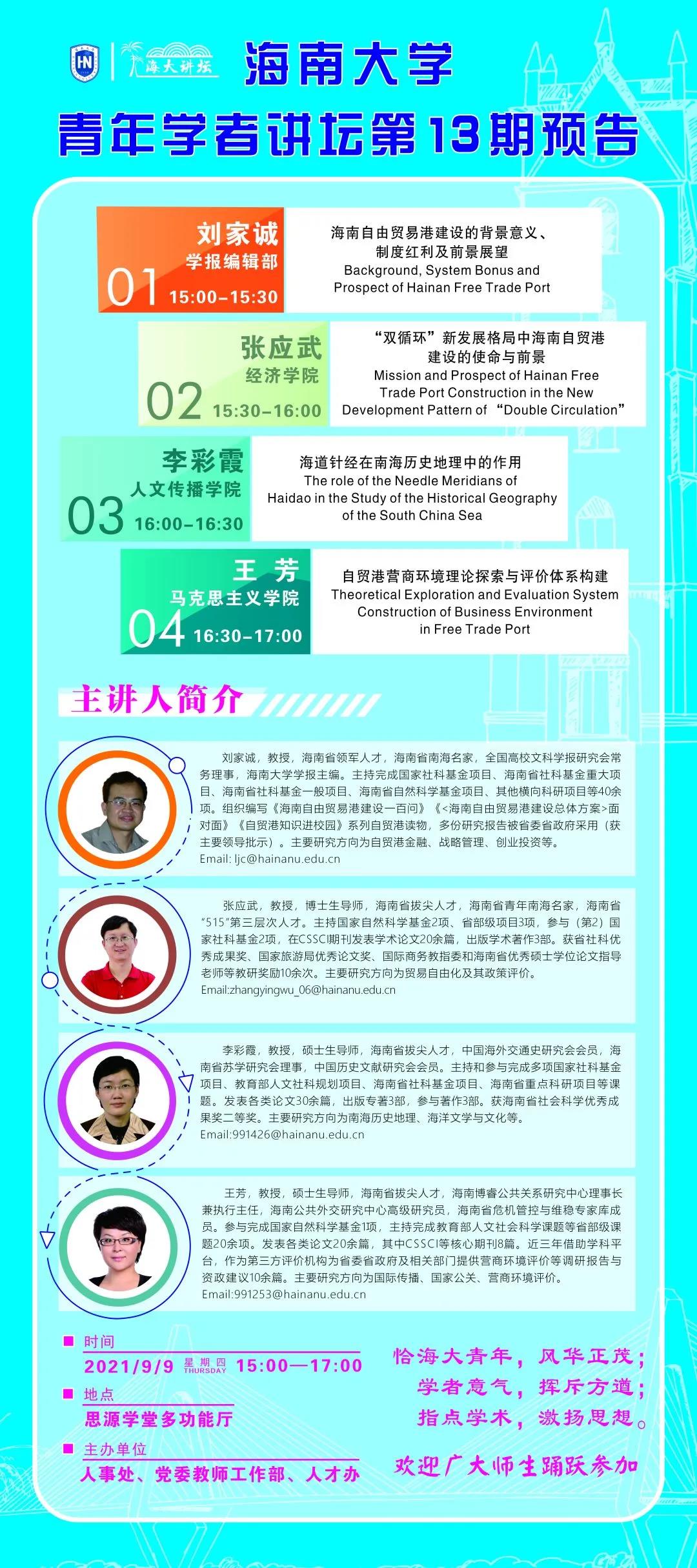 海南大学青年学者讲坛是由海南大学人事处、党委教师工作部、人才办联合主办,邀请校内青年学者就学术前沿与热点问题开展交流研讨,旨在进一步加快推进学校“双一流”建设,加强青年教师学术交流,促进学科交叉融合,营造良好学术氛围,提升教学科研水平。