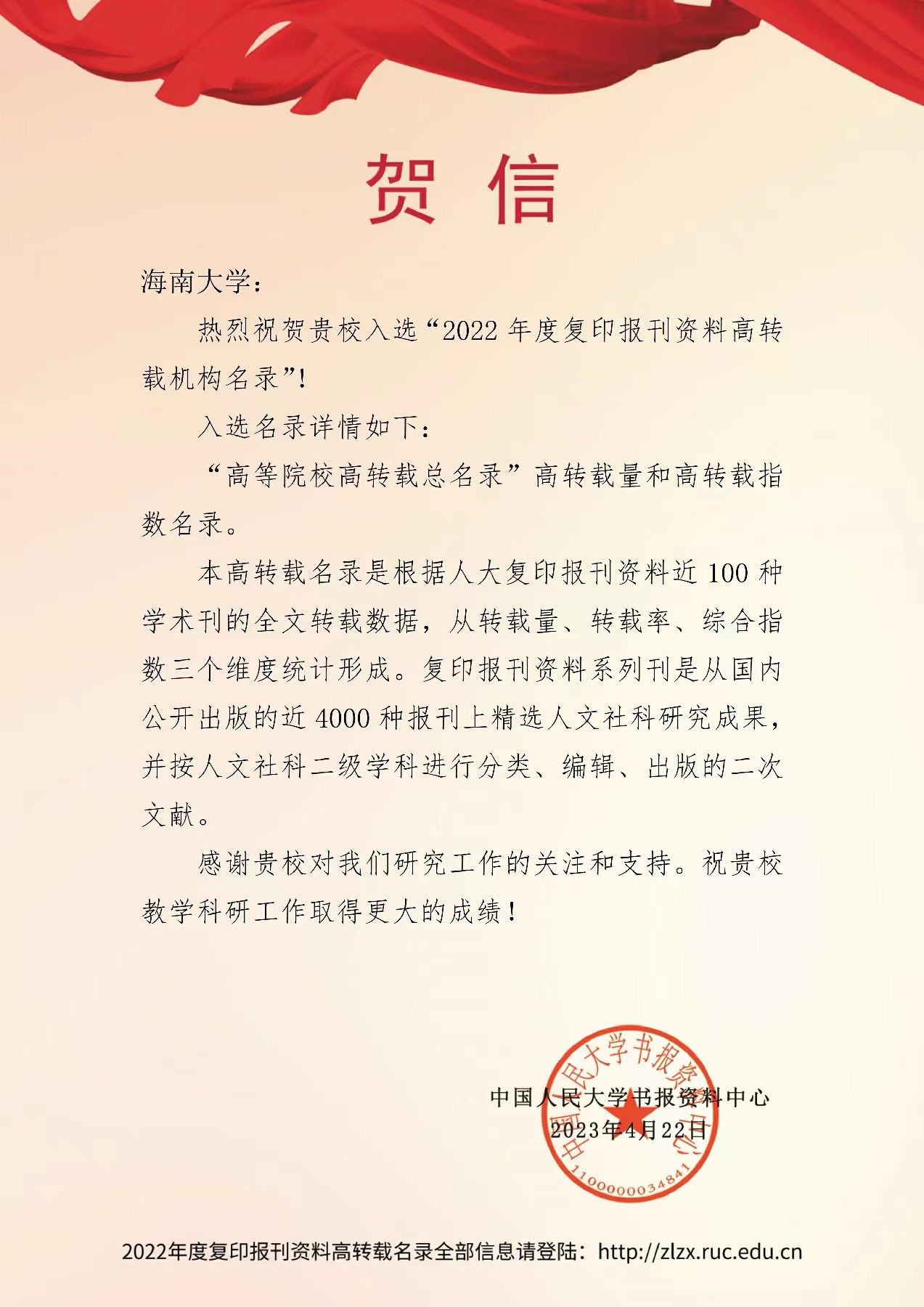 热烈祝贺海南大学入选“2022年度复印报刊资料高转载机构名录”!