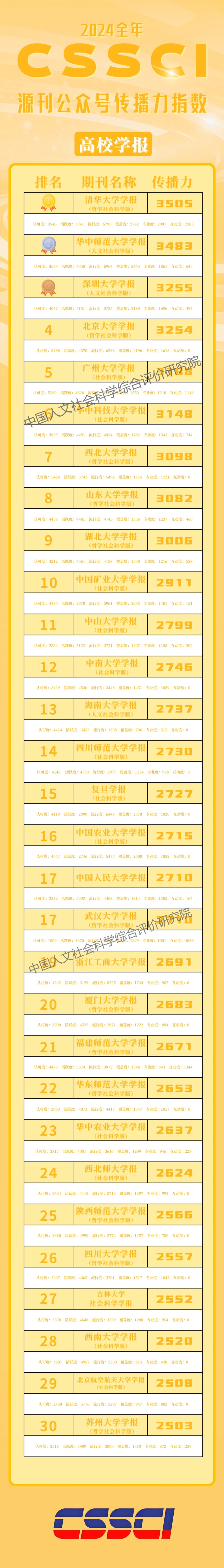 2024年,“CSSCI源刊微信公众号传播力指数”覆盖700余种CSSCI来源期刊(含扩展版)的公众号,对2024年全年发布的九万余篇推文数据进行分析,并构建指数模型,旨在多维度反映学术期刊融合传播状况,为学术传播选择新的媒介形态提供有效的多元路径,为学术期刊评价提供新的事实数据,助力学术期刊评价体系的进一步完善。